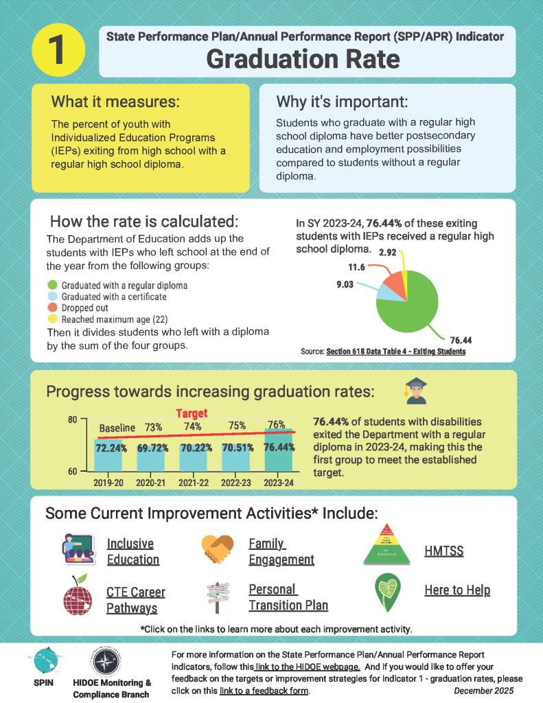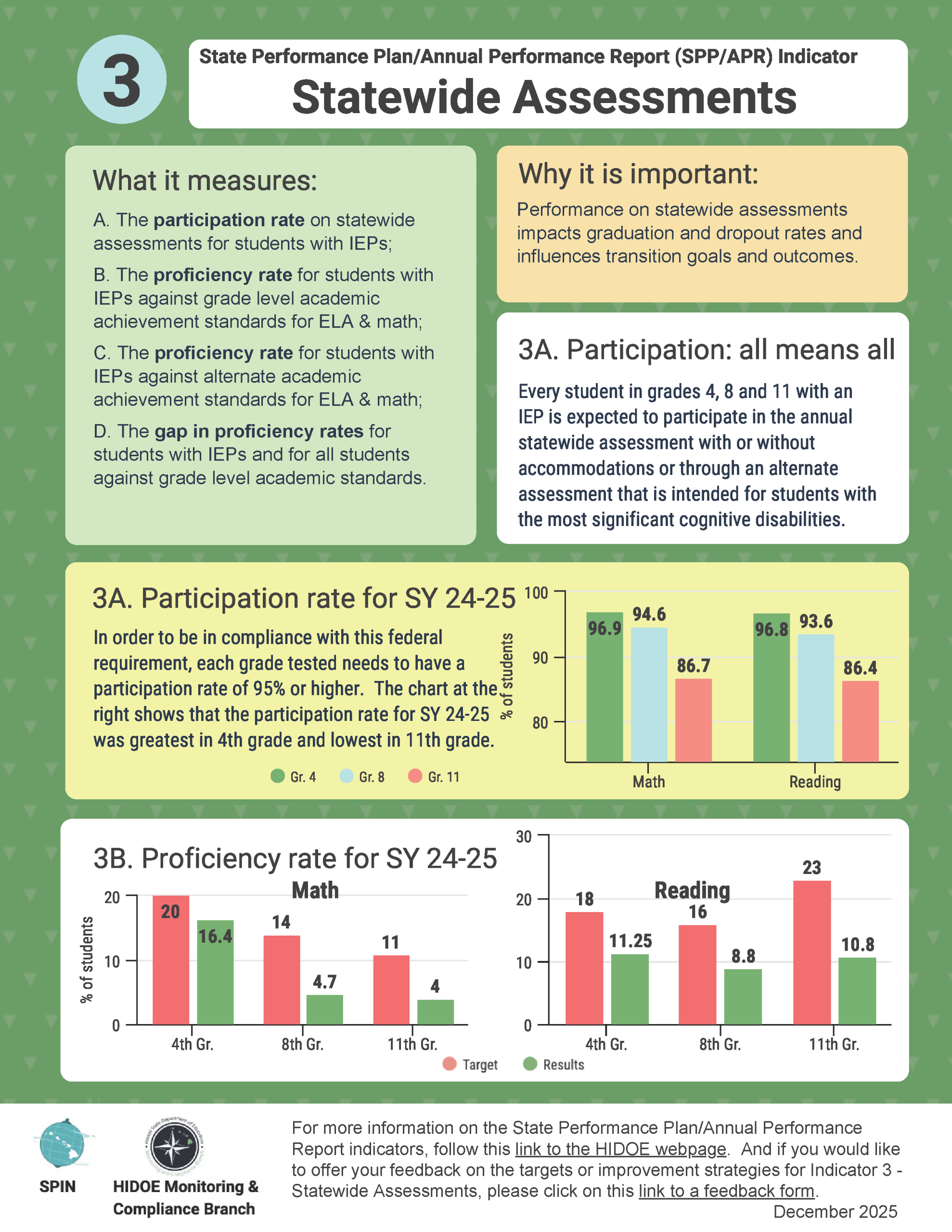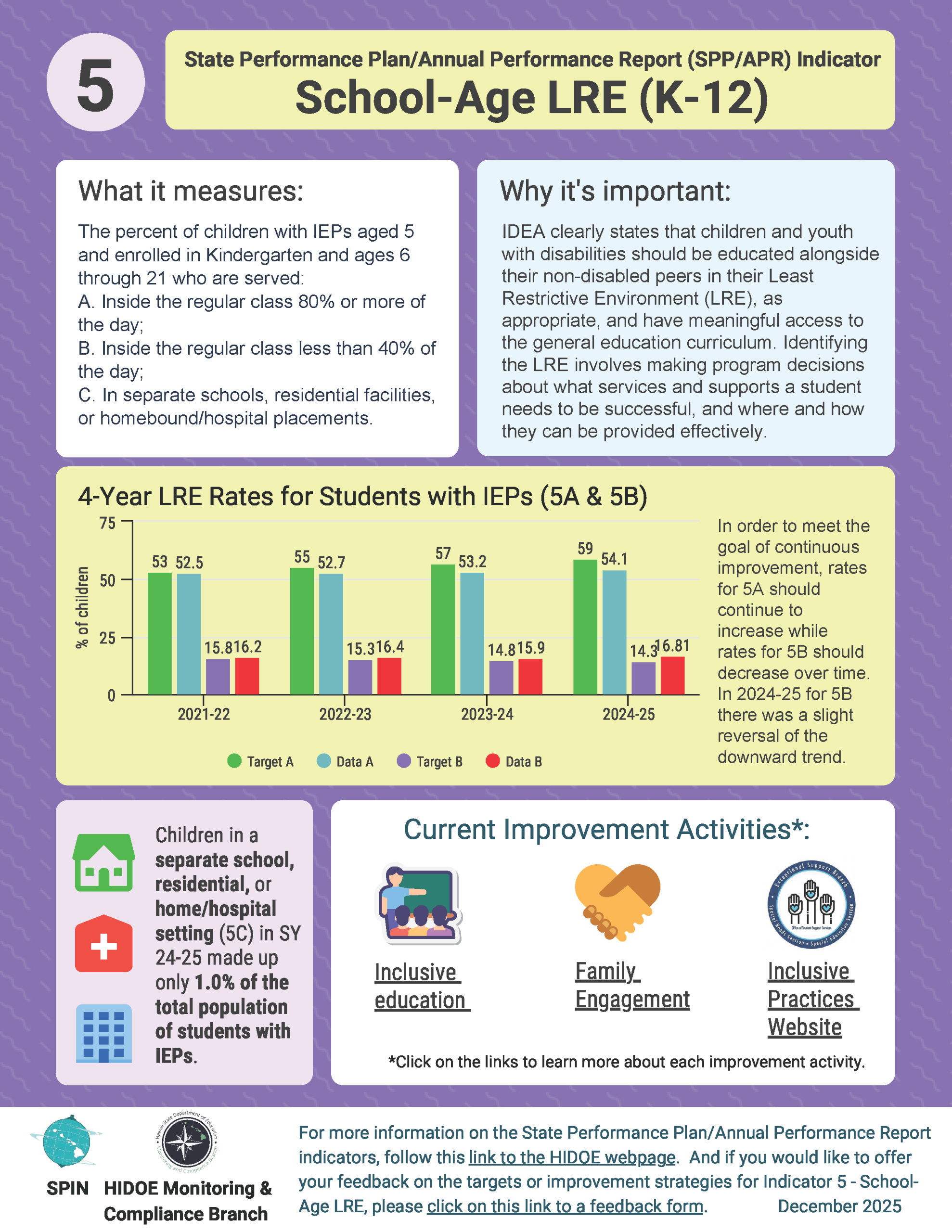 Hawaii DOE Indicator Data, Infographics and Feedback website for the 2024 SPP/APR submission: Click here