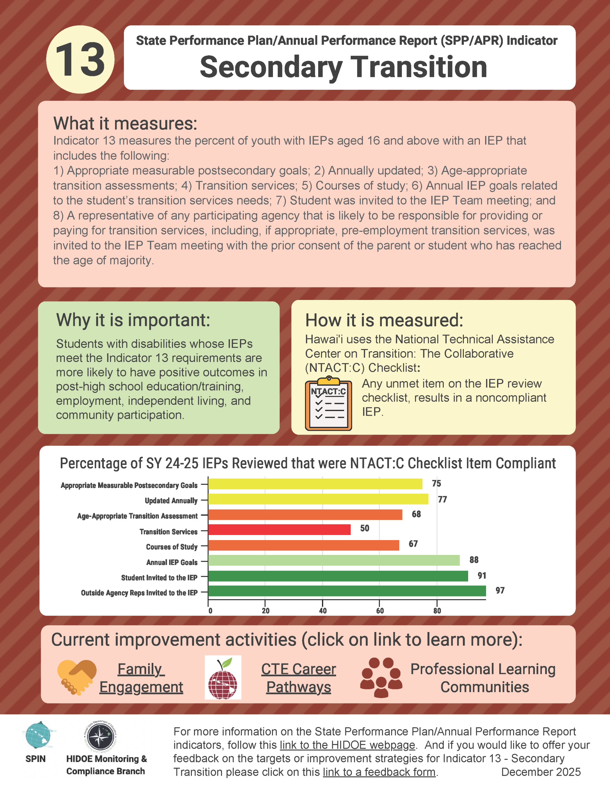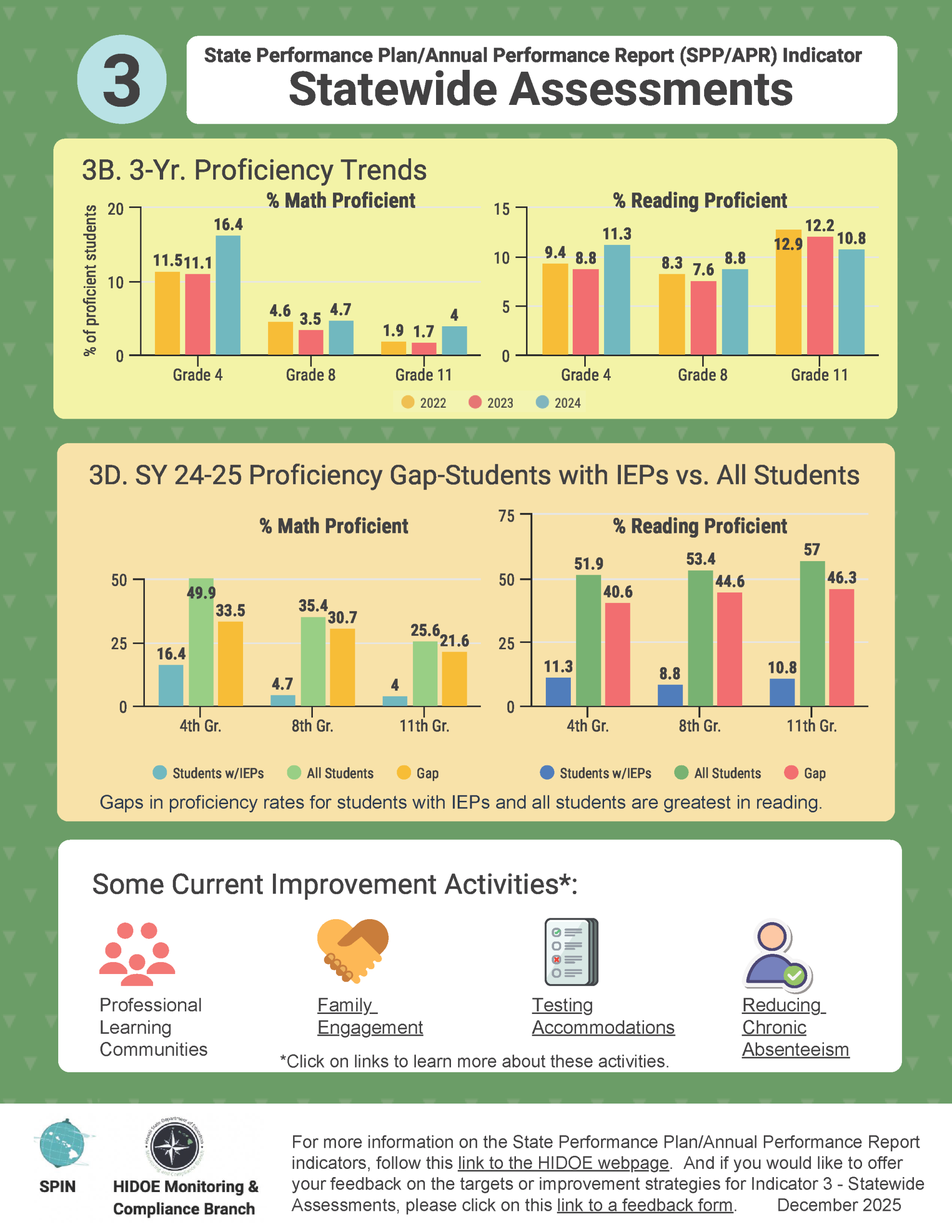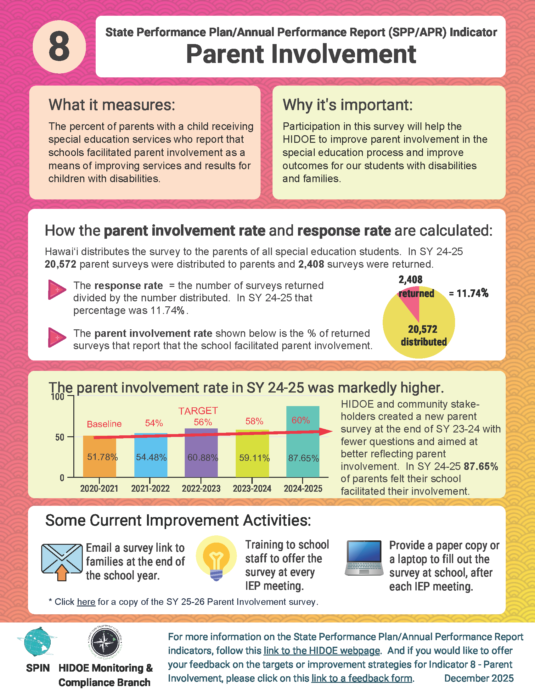 Hawaii DOE Indicator Data, Infographics and Feedback website for the 2024 SPP/APR submission: Click here